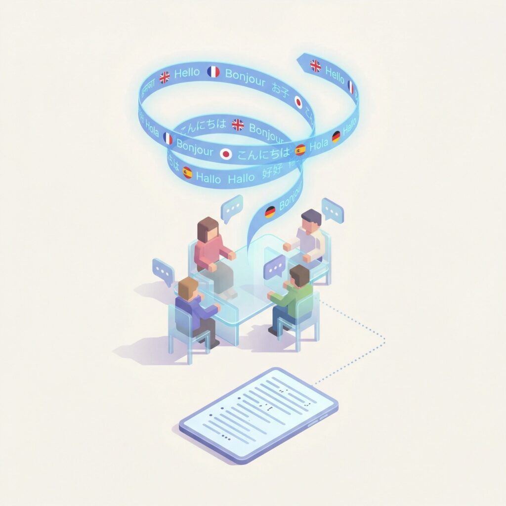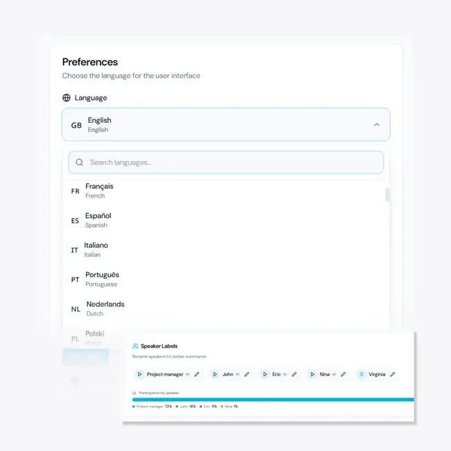 Transcribe meetings in real-time across 60+ languages. Automatic speaker identification keeps track of who said what – no manual tagging needed.